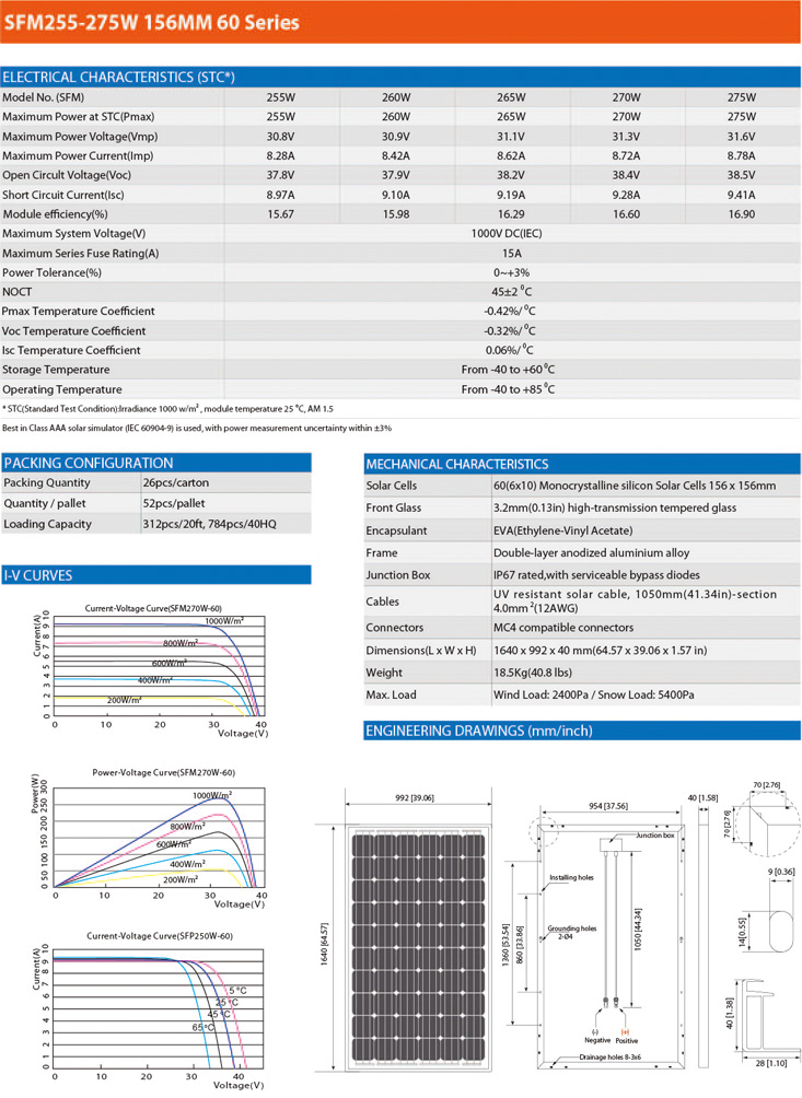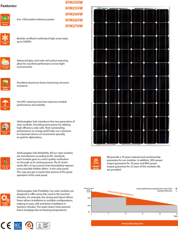 SUFU High Efficiency 72 Solar Cells SFM250W-270W